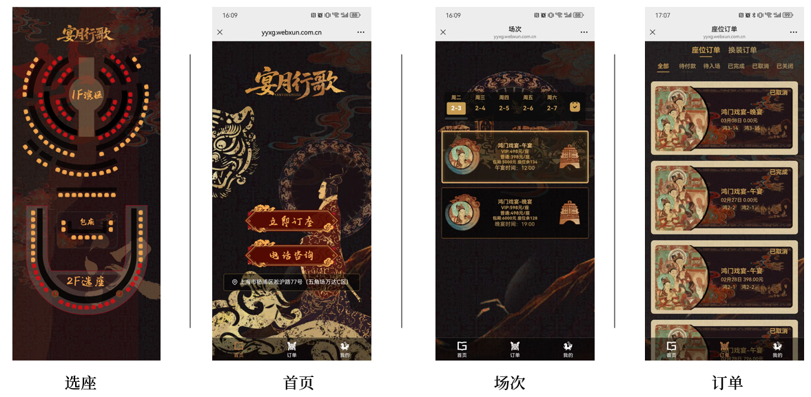 运营单位委托上海迅速网络团队开发“宴月行歌”小程序版本和H5(公众号)版本,满足客户提前选座,到店直接体验的核心需求。#宴月行歌#鸿门戏宴#沉漫式餐秀#汉文化体验#戏宴,点击查看宴月行歌现场氛围