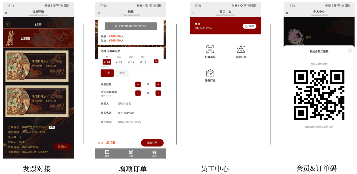 “宴月行歌”小程序版本和H5(公众号)版本系统功能包括了:用户预约选座、小程序&H5支付、不同类型订单管理(小程序订单/公众号订单/手动订单)、抖音团购核销、门店员工核销功能、包场/休息设置、企业员工角色和权限管理(包括改单和内部价等)。