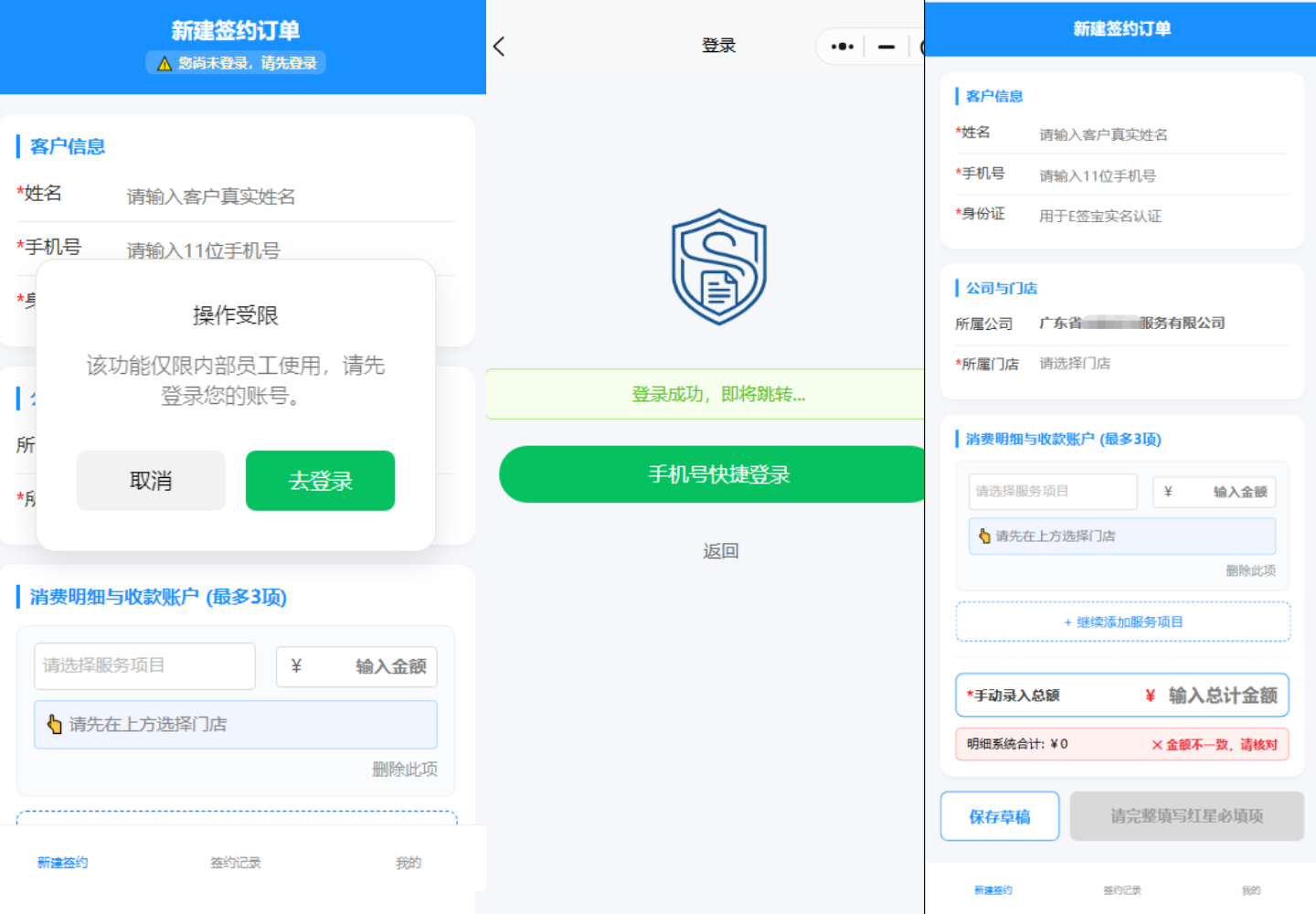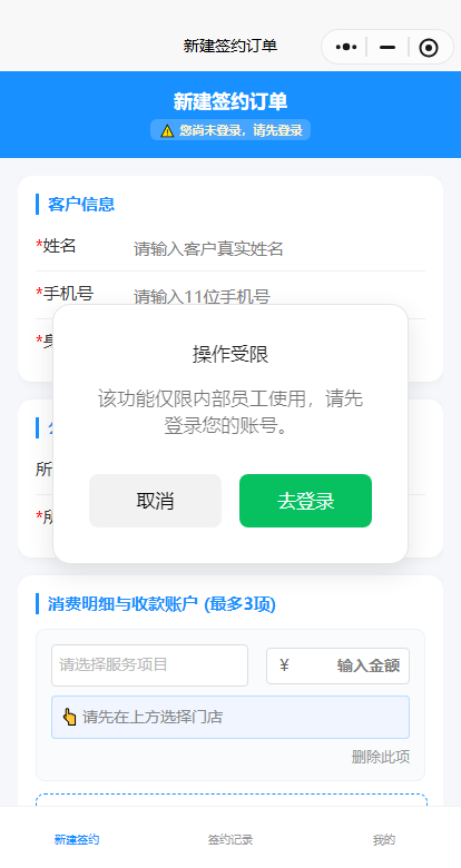 迅速网络深度贴合杭州米加诺的业务场景与管理需求,打造了业务员专属小程序端 + 全权限后台管理端双端联动的数字化系统,深度对接e签宝电子签平台,构建了从客户信息录入、主体门店匹配、服务项目管理、金额智能核验、电子合同网签、签约全流程追踪到数据统一管理的全链路数字化闭环,同时搭建分级分权的精细化权限体系,全方位保障业务操作安全与合规。