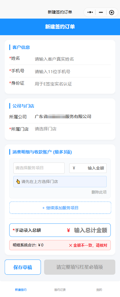 - 多维度主体与服务智能匹配:支持按省份、城市查询主体公司与对应门店,业务员可选择服务项目、填写金额,适配多元化业务场景。