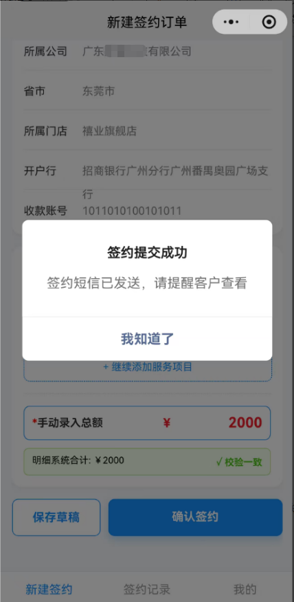 - 一键网签与全流程追踪管理:业务员提交信息后,系统自动将签约数据推送至e签宝发起网签,并同步向客户发送签约短信。业务员可在签约记录中查看状态、复制签约短链,全程高效跟进。